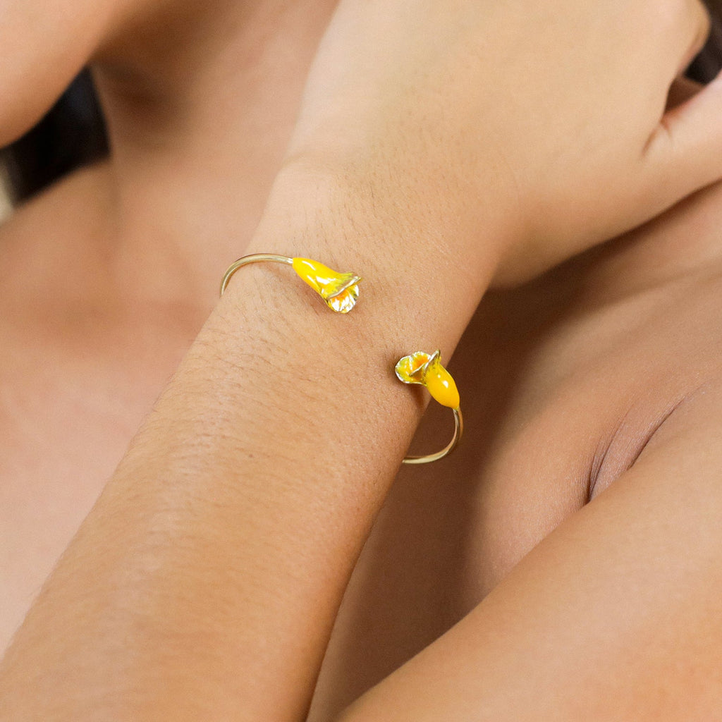 Betty is the dose of color your summer was missing. Inspired by the California poppy, this collection brings out pops of enamel flowers, in jewelry form. In bud or in full bloom, they display bold hues like fiery orange, intense red, and bright pink. Each flower jewel is handcrafted from gold-plated brass and enhanced with natural stones like agate and howlite. Vibrant, sunny, and untamed: The new Betty collection is your true nature expressed!