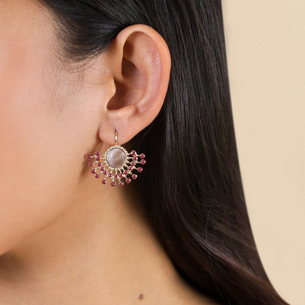 Lauryne is that luminous touch that transforms your everyday life into a sweet interlude. It's the chic softness you've been looking for! Delicate jewelry that highlights the subtle sparkle of brown and white mother-of-pearl, the originality of pink abalone, the freshness of agate, and the luminous softness of howlite. Here, everything sparkles without being over the top, everything radiates with elegance. Gone are the days of overly classic jewelry; welcome to ethereal pieces enhanced with deep garnet, glass beads, and touches of colorful enamel. Lauryne is the poetic and modern touch to add to your look, perfect for displaying a discreet yet assertive femininity.