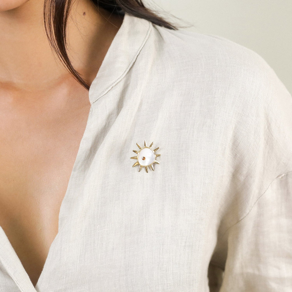Nora is a collection that hits the mark: engraved heart, stylized sun, raw radiance. Hand-mounted, fine gold-plated jewelry with white mother-of-pearl, bone, cultured pearls, and just the right amount of Swarovski to capture the light. The result? A balanced mix of symbolic power and bold style. Nora is the perfect alchemy of sunny jewelry, clean lines, and noble materials. Clearly your next obsession.