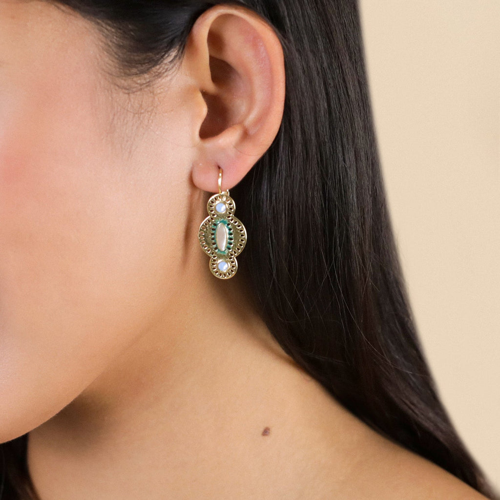 Zélie jewelry is made for you if you want to wear natural stone jewelry, turquoise earrings, or pink mother-of-pearl jewelry that will add sparkle to your style without any hassle. A youthful, refined, and always on-the-go spirit. Slip it on to effortlessly boost your evening outfit. Zélie is the little, luminous jewel that says it all, even when you're not saying anything. Zélie is the chic, feel-good touch for those who want beauty, naturalness, and a ton of personality.